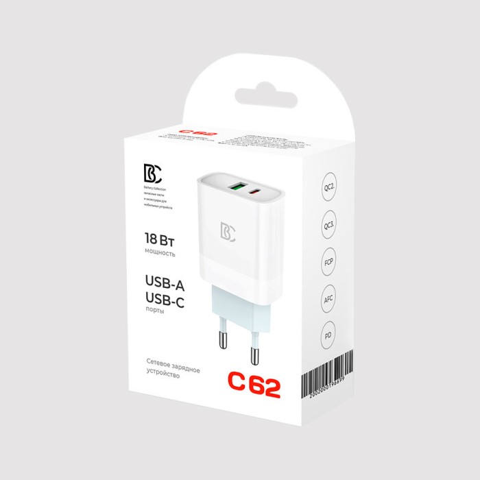 Сетевое зарядное устройство USB/Type-C BC C62 (18W, QC3.0, PD, 2 порта) Белый